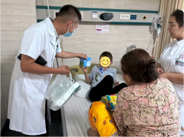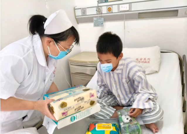 在新疆,小患者麦买提(化名)接过医生叔叔送来的“贴心包”礼物,在表达感谢的同时与大家分享康复出院的好消息:“感谢基金会和爱心人士对我的帮助,感谢医院对我的手术治疗。我康复了,明天就要出院啦!”